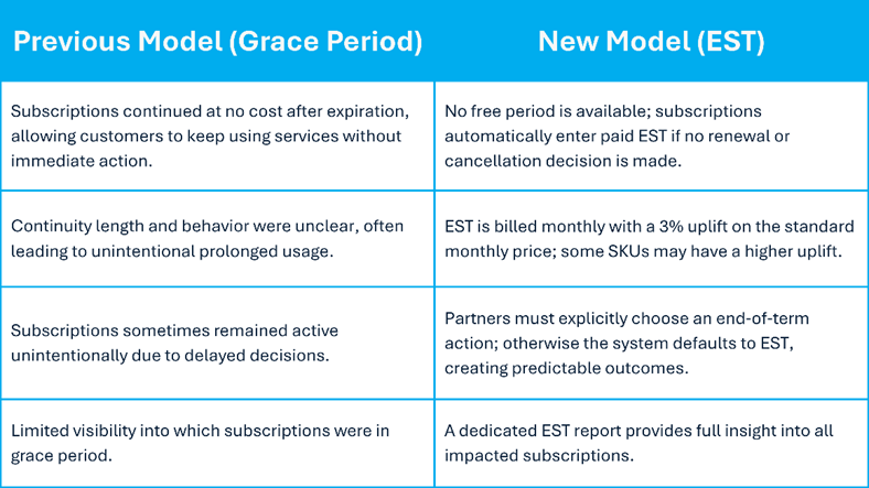 During EST, the service continues uninterrupted, but billing immediately switches to the standard monthly price plus a 3% uplift, and certain SKUs may incur an even higher uplift if they do not have an equivalent monthly term. Despite the added cost, EST provides a safety net that prevents customer downtime. It also allows partners to terminate or convert the subscription at any time, and billing is prorated to ensure customers pay only for the exact number of days used during EST. This brings far greater transparency than the previous grace period ever offered.